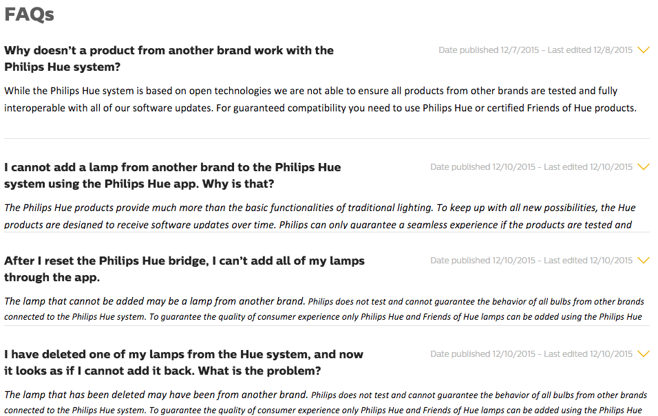 Yesterday a thread on /r/homeautomation published that Philips Hue now blocks all but their own bulbs and those of “friends of Hue”. I have been able to confirm this in the Philips Hue FAQ (Update Dec 14: they have removed the entries - mirror here):