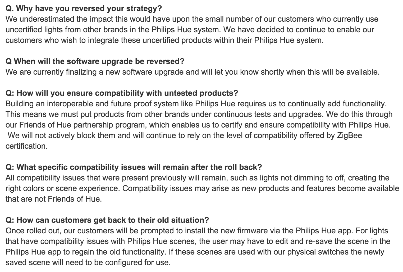 Philips Hue FAQ entries regarding reversing the decision.
