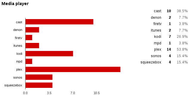 Philips Hue is the “winner” in the light category closely followed by MQTT lights. Google Cast and Plex are the top media player platforms. Pushbullet is by far the most-used notification platform. If you followed the recent efforts to improve this platform it’s comprehensible.