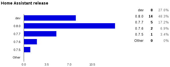 Around a week ago we started with the first survey. Now 30 people have participated. Thank you very much if you did. We think that’s enough time to have some “only partially representative” data. It’s hard to tell how many Home Assistant users are out there. Currently there are 215 members on our Discord chat server and last week PyPI counted 5063 downloads.