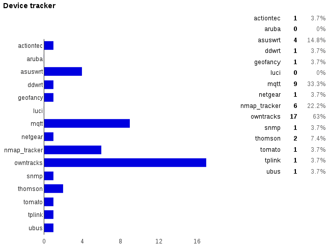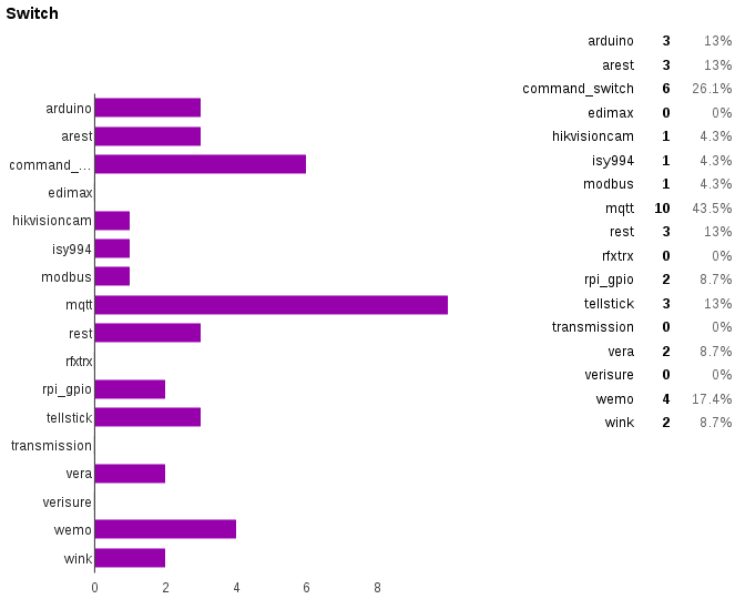 It’s interesting to see that most of the sensor, switch, and thermostat platforms are used. A lot of people seem to be interested in the weather data provided by the Forecast sensor. The MQTT sensors and switches are deployed in almost 50% of all Home Assistant setups.