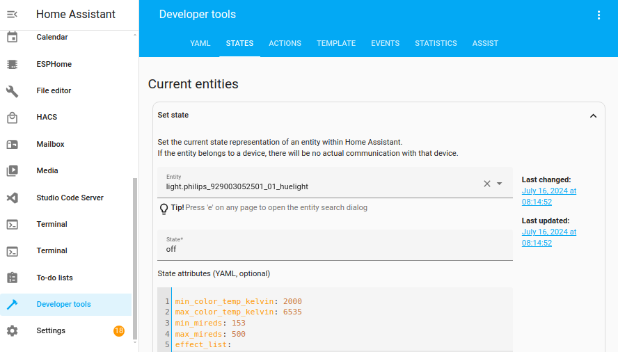 Note that this is the state representation of a device within Home Assistant. That means, it is what Home Assistant sees, and it does not communicate with the actual device in any manner. The updated information can still be used to trigger events, and state changes. To communicate with the actual device, it is recommended to perform actions in the Actions section above, instead of updating state.