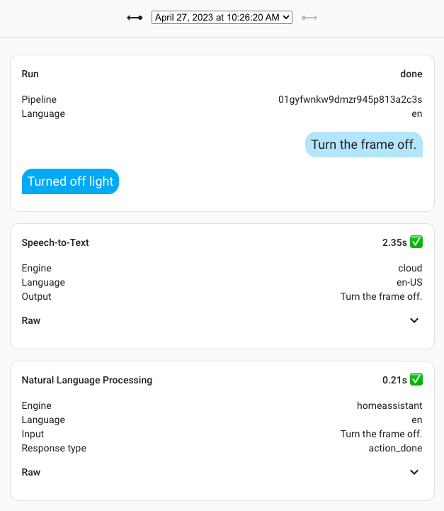 Interacting with many different services means that many different things can go wrong. To help users figure out what went wrong, we’ve built extensive debug tooling for voice assistants into Home Assistant. You can always inspect the last 10 interactions per voice assistant.
