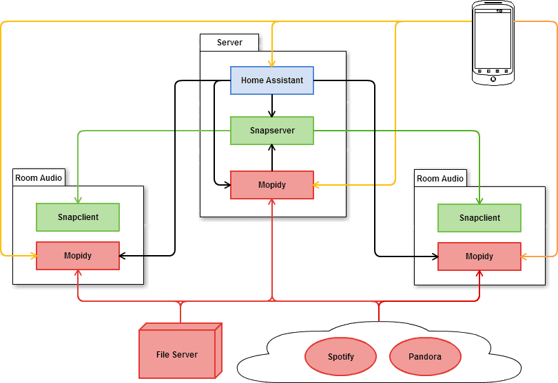 You’ll need two key software packages, besides Home Assistant. The first is Mopidy, a music server that can play local files, or connect to streaming music services like Spotify. The second is Snapcast, which enables synchronized audio streaming across your network. Both can be integrated into Home Assistant. Each room audio device will run an instance of the Snapcast client, and optionally a Mopidy instance. Your server will run a special instance of Mopidy and the Snapcast server.
