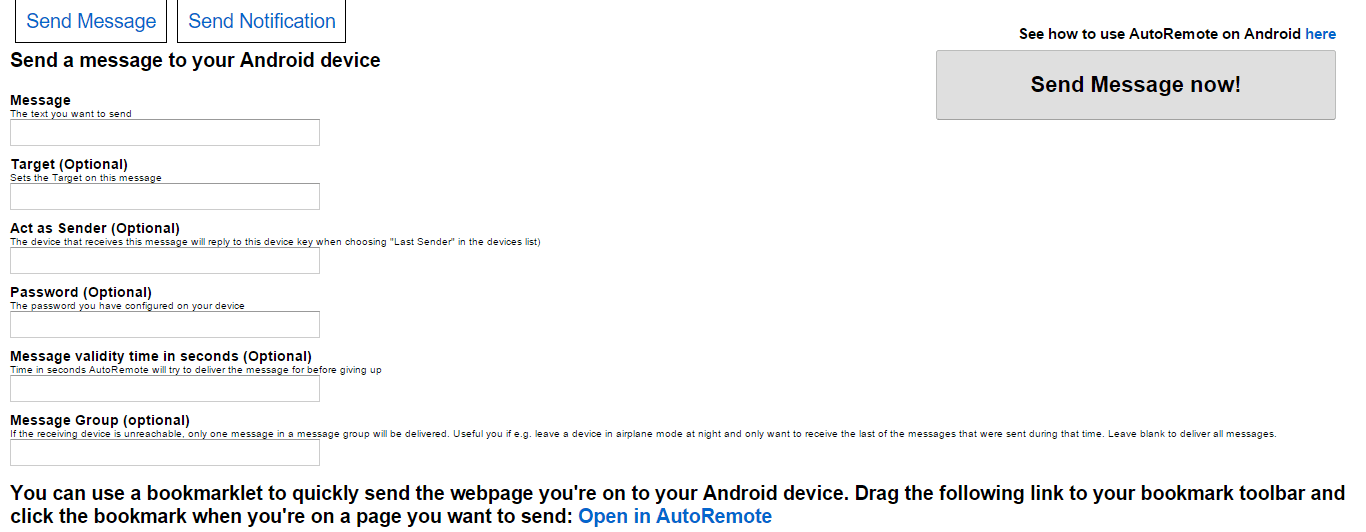 First things first you should install Tasker and AutoRemote onto your Android device and launch AutoRemote. You should see a URL above the QR code, visit it in your browser and it should bring up a page a bit like this.
