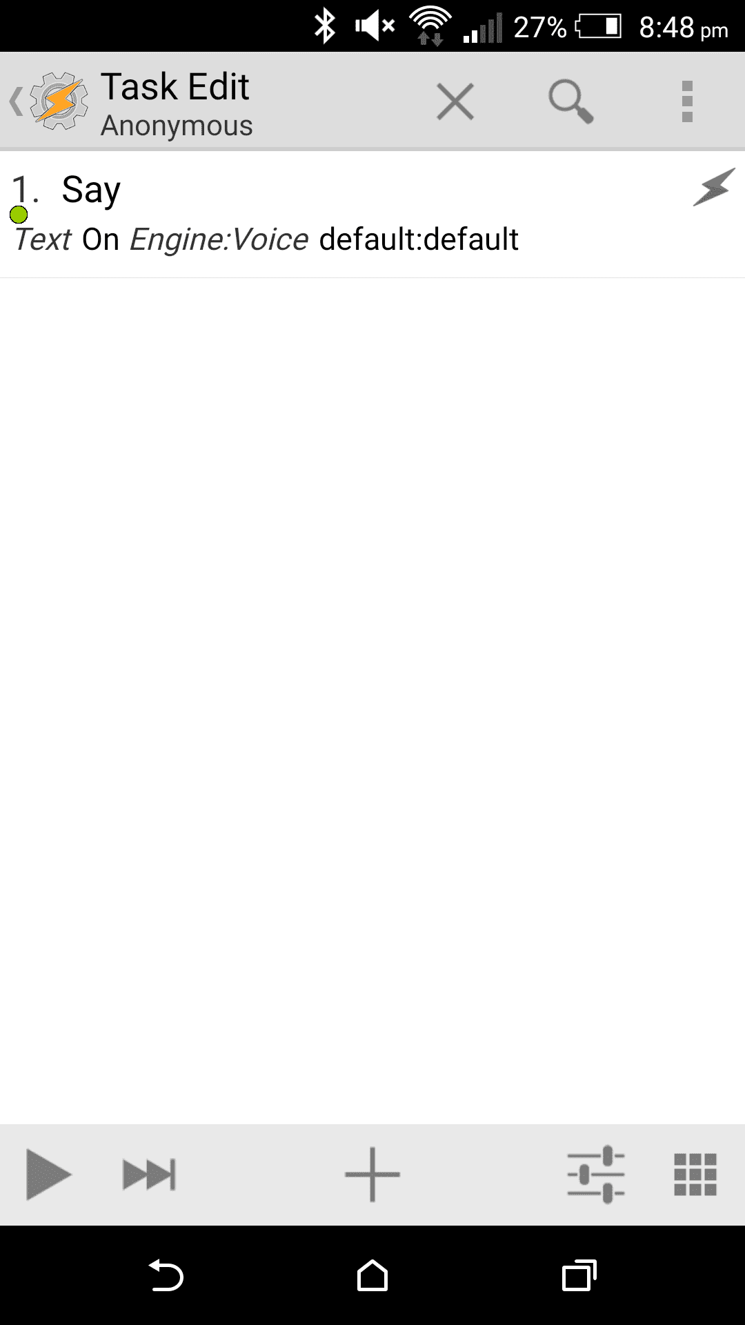 This is where we’ll configure our task, so select the plus icon to select an action. Select Alert -> Say to add a Say action. Enter On in the text field and go back to test your task, make sure your media volume is up then select the play icon, you should hear your device say “On”.