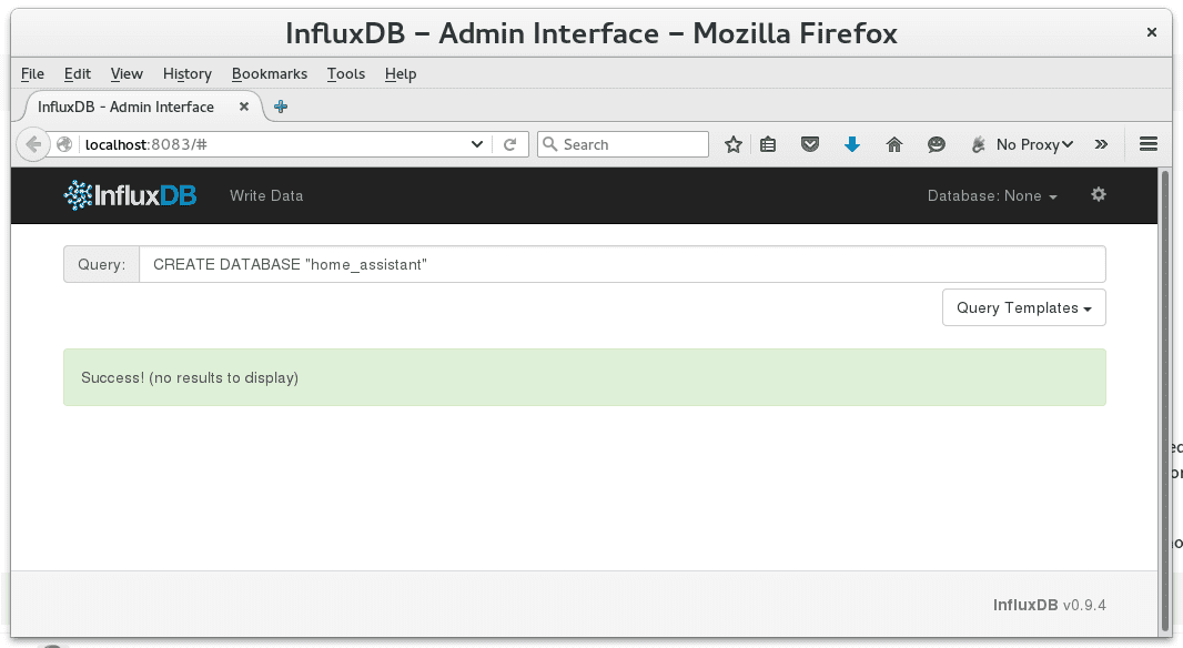 If everything went well, then the web interface of the database should be accessible at http://localhost:8083/. Create a database home_assistant to use with Home Assistant either with the web interface or the commandline tool influx.