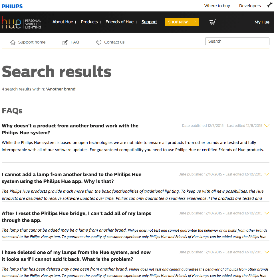 Yesterday a thread on /r/homeautomation published that Philips Hue now blocks all but their own bulbs and those of “friends of Hue”. I have been able to confirm this in the Philips Hue FAQ (Update Dec 14: they have removed the entries - mirror here):