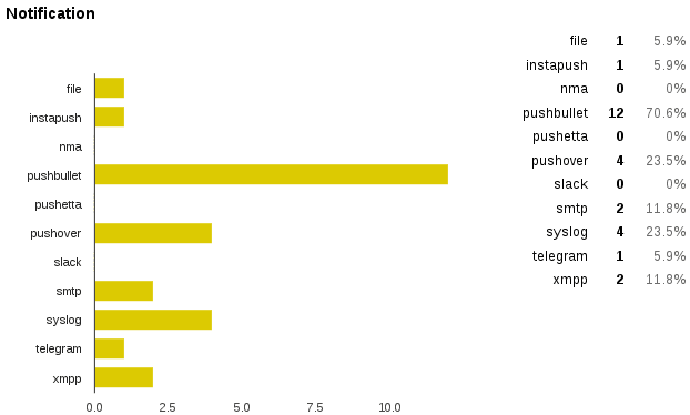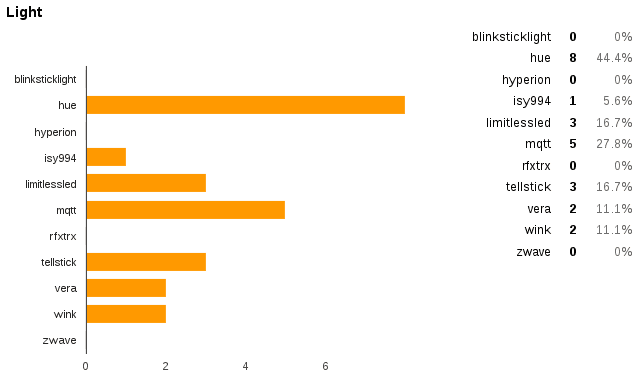 Philips Hue is the “winner” in the light category closely followed by MQTT lights. Google Cast and Plex are the top media player platforms. Pushbullet is by far the most-used notification platform. If you followed the recent efforts to improve this platform it’s comprehensible.