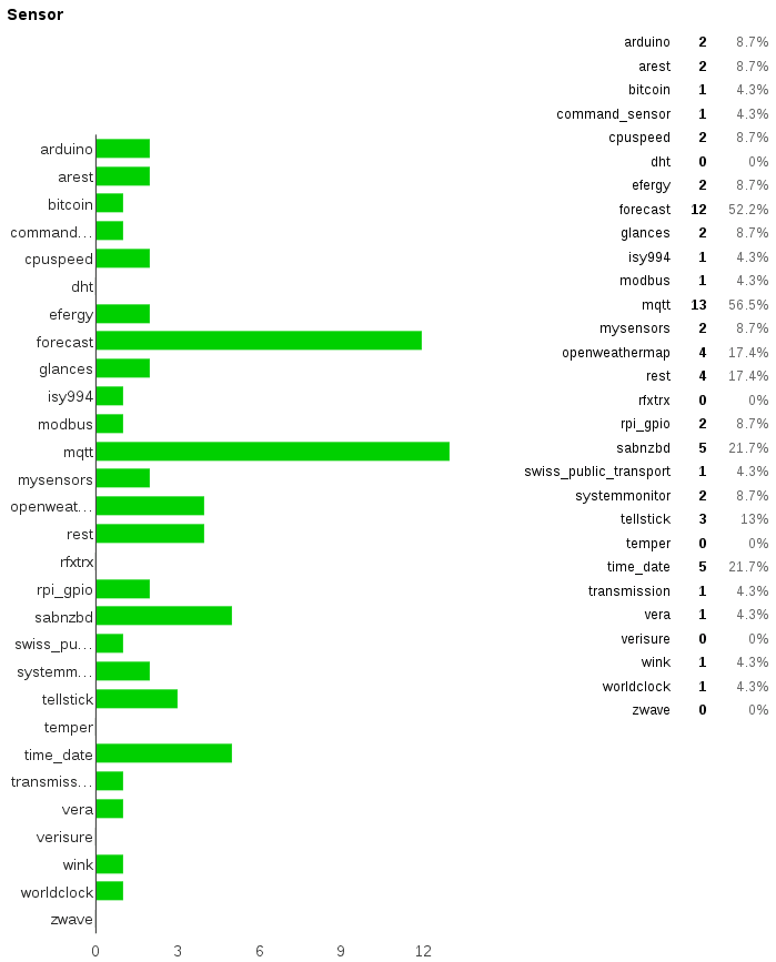 It’s interesting to see that most of the sensor, switch, and thermostat platforms are used. A lot of people seem to be interested in the weather data provided by the Forecast sensor. The MQTT sensors and switches are deployed in almost 50% of all Home Assistant setups.